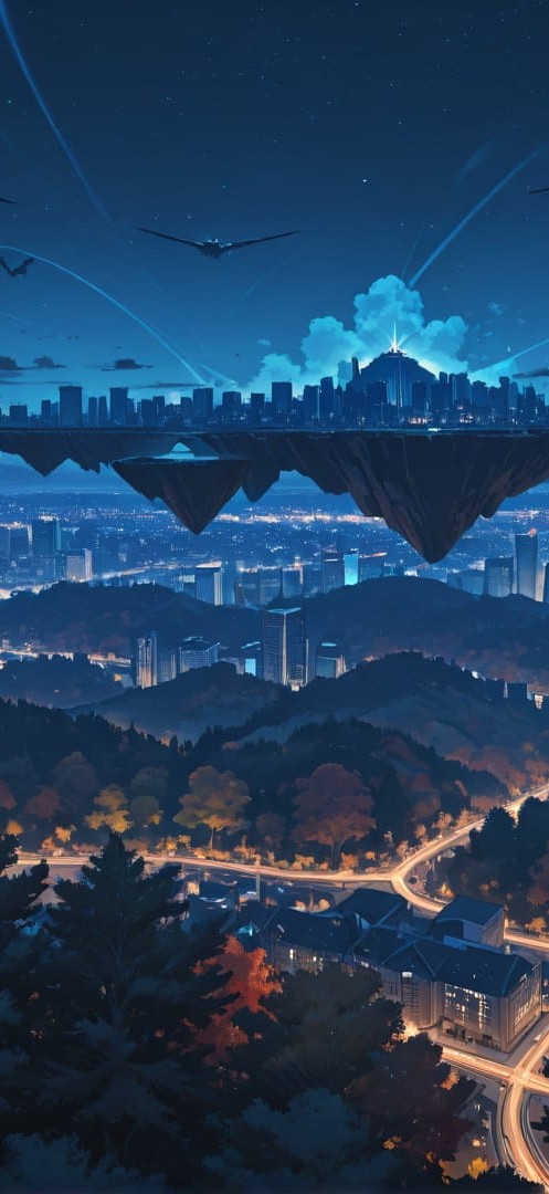 Blue Night City FloatingIslands smartphone wallpaper free download, vertical 16:9 format, Blue, Night, City, Autumn