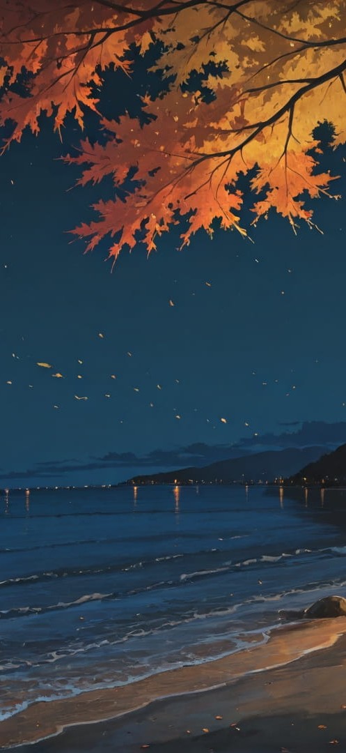 Yellow Night Sea Japanese smartphone wallpaper free download, vertical 16:9 format, Yellow, Night, Sea, Autumn