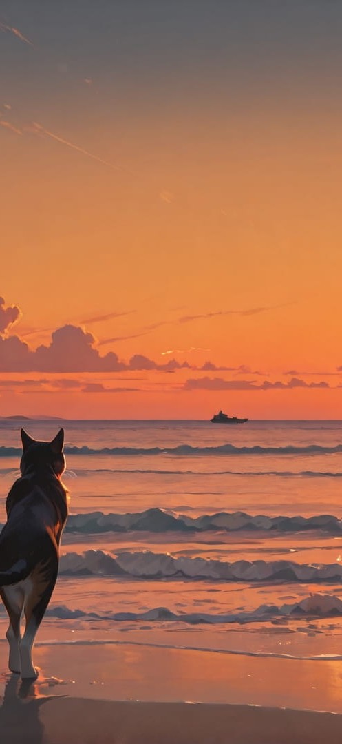 Orange Sunset Sea Cat smartphone wallpaper free download, vertical 16:9 format, Orange, Sunset, Sea, Summer 001